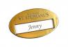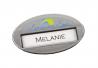 Flaches ovales Kunststoff-Namensschild in verschiedende Farben, und mit zusätzlicher Veredelung der Front in Metalloptik, in hochwertiger Folienprägung. Mit perforierten Papierkärtchen (auf DIN A4 Bögen) und Abdeckfolie für den Einzelnamensdruck. Schildergröße: 65x38 mm Fensterfeld 50x12 mm.